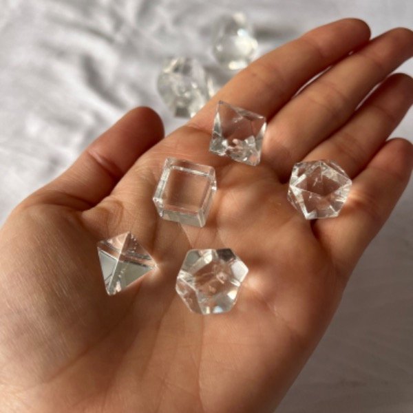 Kit de 5 Sólidos Platónicos de Cuarzo Cristal: Tetraedro, Hexaedro, Octaedro, Dodecaedro, Icosaedro. Tamaño Chico.